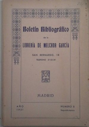 BOLETÍN BIBLIOGRÁFICO DE LA LIBRERÍA DE MELCHOR GARCÍA - AÑO 1951 Nº 8 - SEGUNDA ÉPOCA. LIBROS RAROS O CURIOSOS Y ALGUNOS RAROS DE INTERÉS